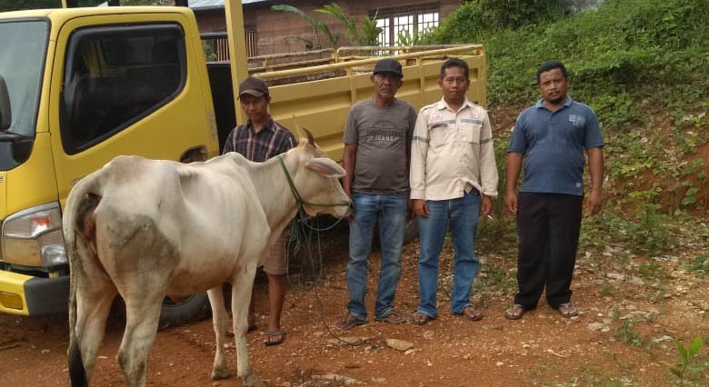 Penyerahan 1 ekor sapi PT RBU Group untuk membantu perayaan Maulid Rasulullah SAW warga Desa Rantau Bakula Kecamatan Sungai Pinang oleh perwakilan PT RBU Group Ruslan Sidiq.(Foto/Ist)