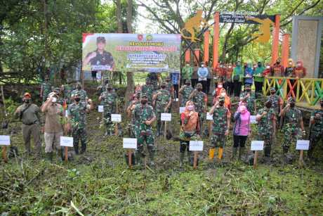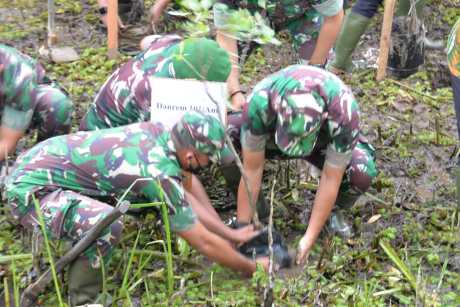 SuarIndonesia -Taman Wisata Alam Pulau Bakut, Kecamatan Anjir Muara, Kabupaten Batola, Provinsi Kalsel, sasaran jajaran Korem 101/Antasari, revolusi hijau dengan penanaman pohon Mangrove Rambai didukung BKSDA, Kamis (25/11/2021).