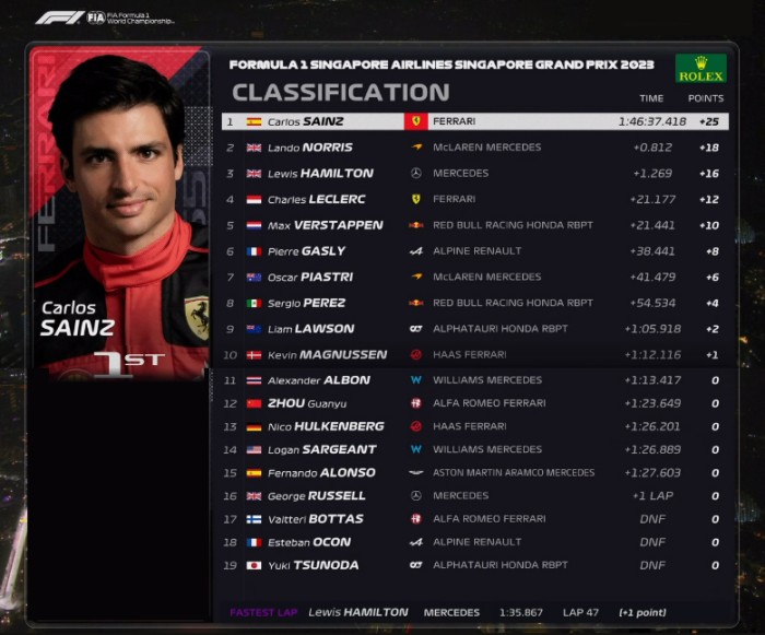 SuarIndonesia — Carlos Sainz Jr berhasil memenangkan Formula 1 GP Singapura 2023 yang berjalan sengit. Lando Norris dan Lewis Hamilton melengkapi posisi tiga besar, sekaligus menciptakan podium pertama tanpa kehadiran Red Bull Racing yang begitu dominan musim ini.