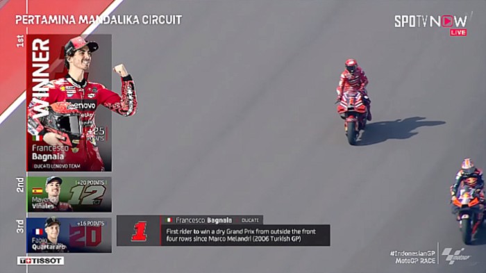 Hingga lap terakhir, Pecco berhasil mempertahankan keunggulan meski jarak mengecil. Vinales membukukan podium kedua dan Quartararo menempati P3.