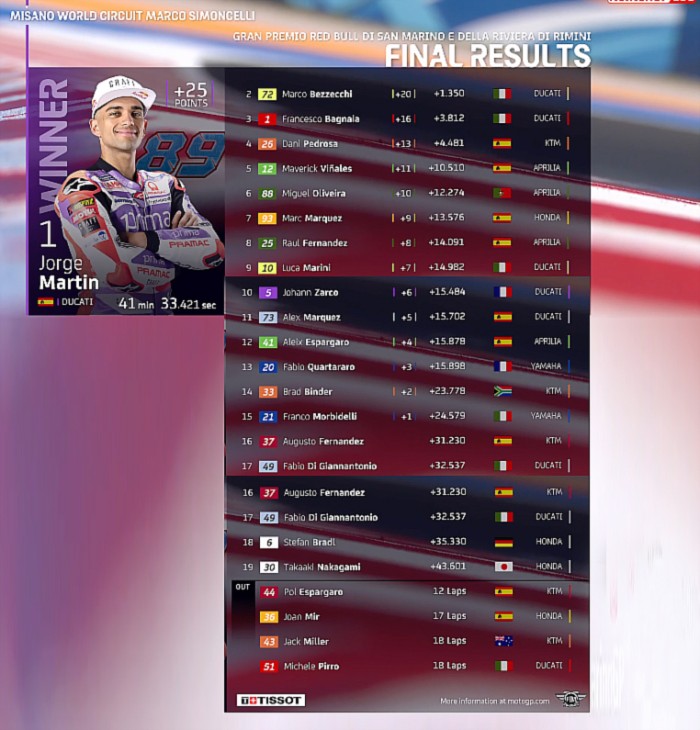 Ia sukses mengasapi dua murid Valentino Rossi sekaligus pembalap tuan rumah, Marco Bezzecchi (Mooney VR46 Racing Ducati) dan Francesco Bagnaia (Ducati Lenovo), yang masing-masing menempati podium kedua dan ketiga. Martin sukses mengemas double winner, karena kemarin juga memenangi sesi sprint.