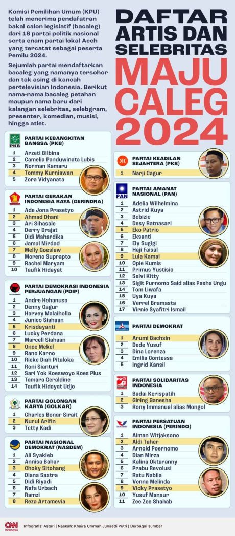 Berikut beberapa artis, dikutip CNN Indonesia yang sudah mendaftar sebagai bacaleg Pemilu 2024