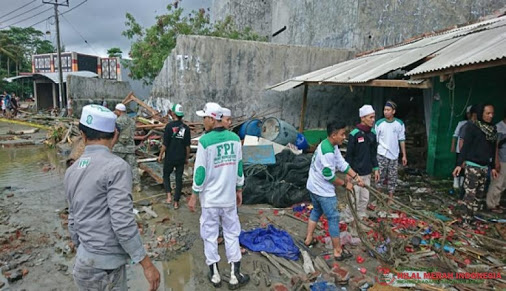 Bantuan seadanya berupa makanan dan pakaian diberikan anggota FPI kepada korban. Warga juga diajak ke tempat yang lebih aman. Mereka juga turut mengevakuasi warga yang telah meninggal dunia. Namun, mereka terkendala keterbatasan peralatan.