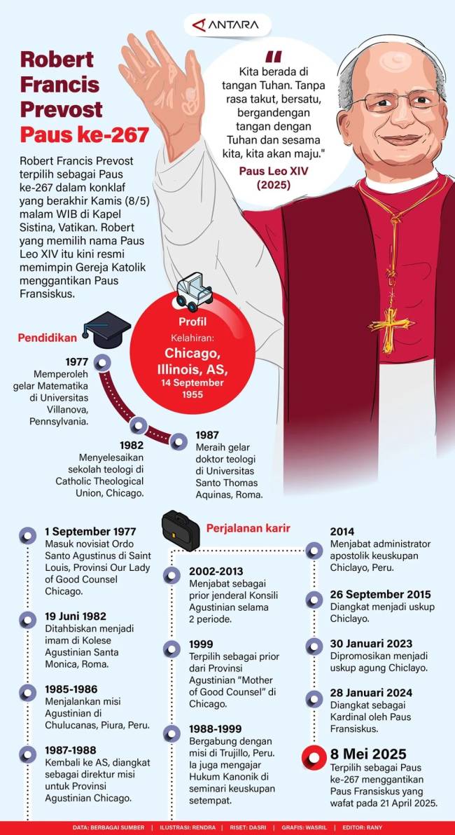 Dilansir dari AntaraNews, Kardinal Robert Francis Prevost terpilih menjadi Paus pertama dari Amerika Serikat dengan nama Leo XIV pada masa kepausannya.