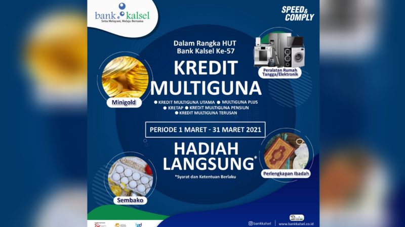 SuarIndonesia – Menyambut Hari Ulang Tahun Bank Kalsel yang ke 57 pada tanggal 25 Maret 2021 mendatang, Bank Kalsel menyemarakkan Program Gebyar Hadiah Langsung Kredit Multiguna.