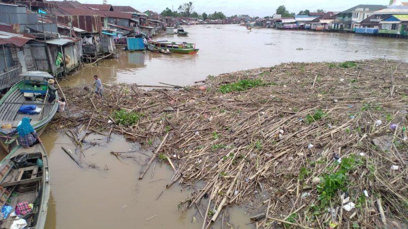 Dampaknya lalu lintas Sungai Martapura terganggu lagi. Sejumlah pasukan turbo Dinas PUPR Kota Banjarmasin sigap mengatasi tumpukan sampah kiriman daerah tetangga itu.