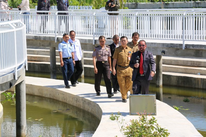 Bagian dasarnya berupa kolam ikan dilengkapi vegetasi khas tropis seperti teratai dan kayu galam.
