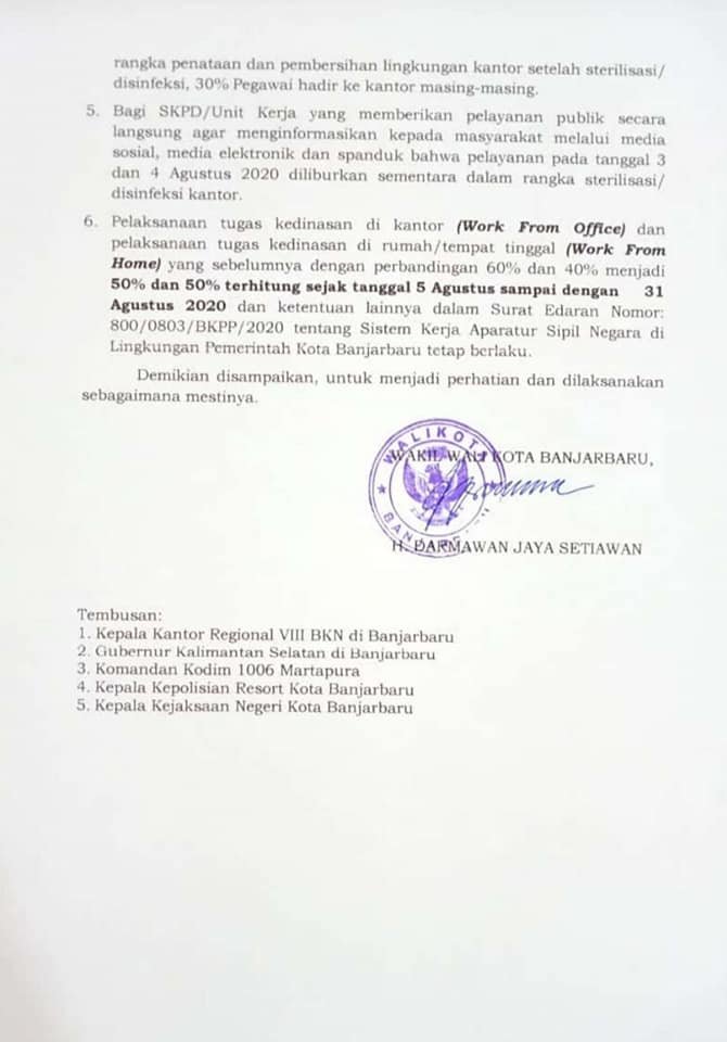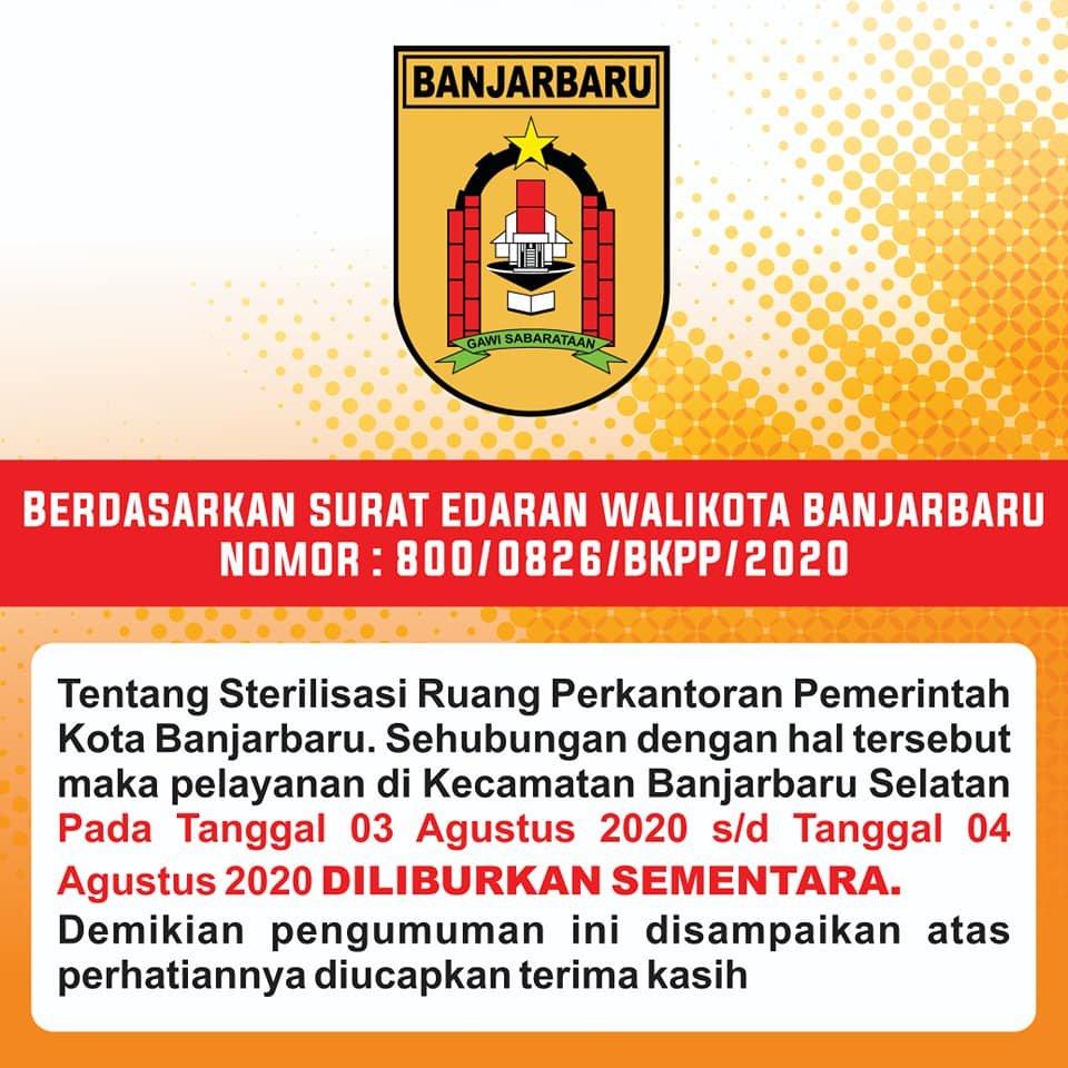 Informasi selanjutnya, guna mensterilisasi sarana pelayanan masyarakat, pada hari Senin (03/08/2020) dan Selasa (04/08/2020) akan diliburkan dan untuk dilaksanakan penyemprotan ruangan, sesuai dengan surat edaran nomor: 800/0826/BKPP/2020 tentang sterilisasi ruang perkantoran Pemerintah Kota Banjarbaru. (SU)