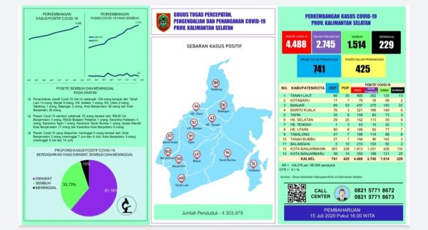Secara kumulatif kasus covid di Kalsel berjumlah 4.488 kasus terdiri dari 2.745 dalam perawatan, 1.514 sembuh, dan 229 meninggal dunia.(RW)