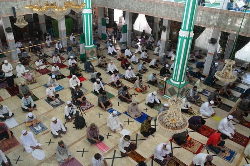 Shalat berjamaah dengan menerapkan protokol kesehatan ketat.(Foto/Dok.SuarIndonesia)