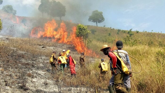 Petugas pemadam kebakaran berupaya menjinakkan si jago merah di Tahura Sultan Adam (Foto: Istimewa/suarindonesia.com)