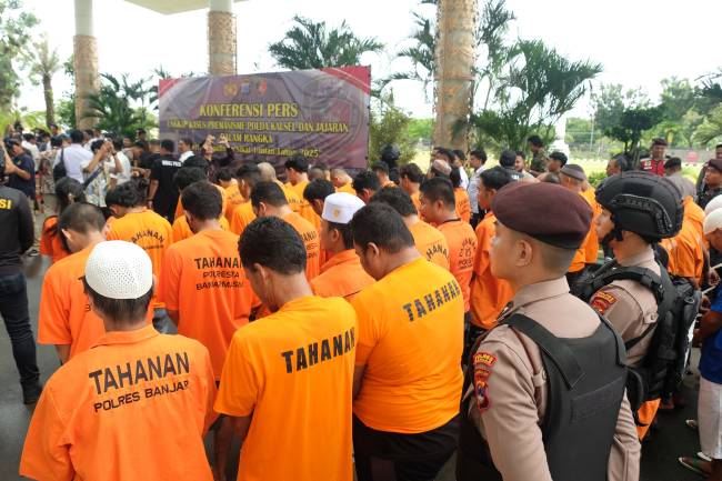 “Semua dengan barang bukti yang menunjukkan berbagai bentuk kejahatan antaraa lain sepucuk senjata jenis airsoftgun, 33 bilah senjata tajam, 106 botol minuman keras, 107 butir obat terlarang, 68 paket sabu-sabu 2 unit mobil, 9 unit motor beserta STNK serta BPKB,” kata Kapolda Kalsel, Irjen Pol Rosyanto Yudha Hermawan, pada konferensi pers, di Mapolda Kalsel, Jumat (9/5/2025).
