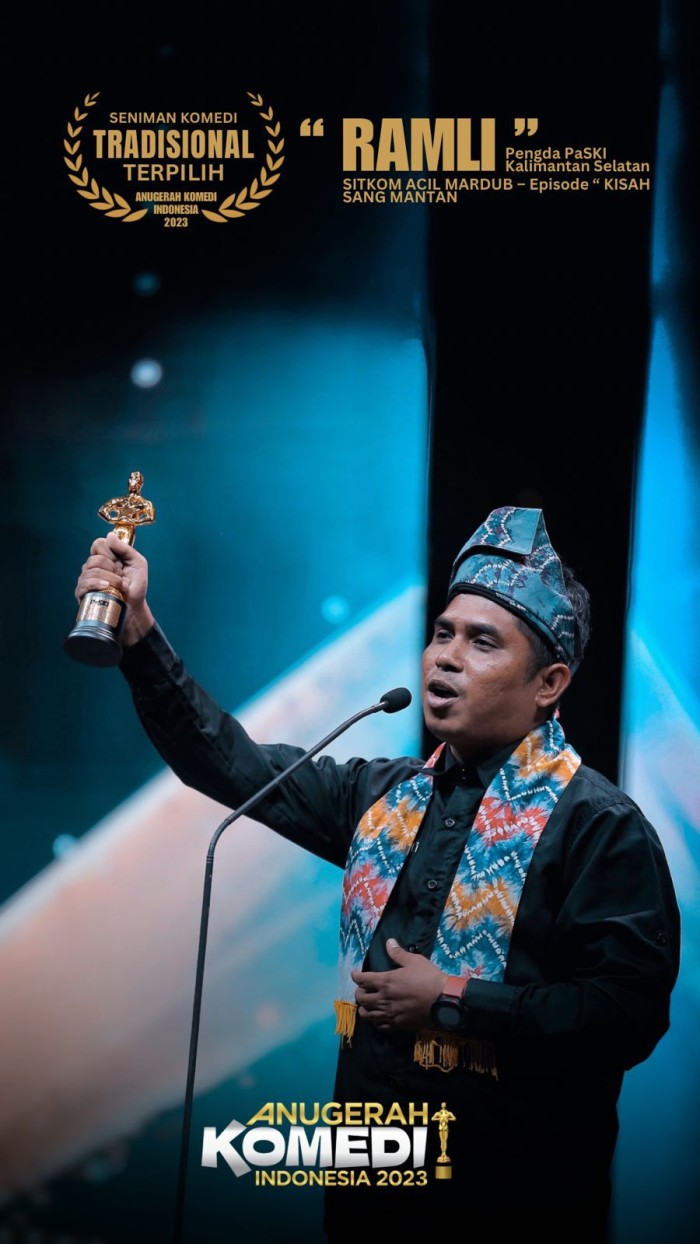 SuarIndonesia- Komedian asal Kalsel, Ramli Suryanaca meraih penghargaan nasional. Ia dinobatkan sebagai Seniman Komedi Tradisional Terpilih melalui Sitkom Acil Mardub episode Kisah Sang Mantan pada Anugerah Komedi Indonesia 2023 yang dilaksanakan di Jakarta, pada Rabu (27/9/2023) malam.