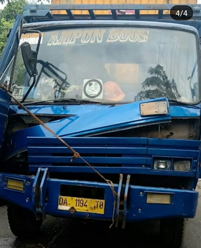 Berdasarkan pantauan, akibat menabrak pohon tersebut membuat truk bernomor polisi DA 1194 TO mengalami kerusakan parah di bagian depan.