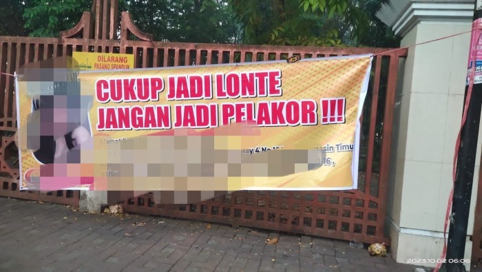 SuarIndonesia – Spanduk warna kuning dengan warna merah bertuliskan “Cukup Jadi Lonte, Jangan Jadi Pelakor” terpampang di Pagar Mesjid Raya Banjarmasin, Rabu (4/10/2023).