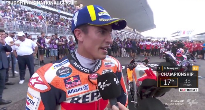 Kemudian yang menarik di peringkat ketiga ada Marc Marquez (Repsol Honda) yang memang bersinar selama akhir pekan di India.