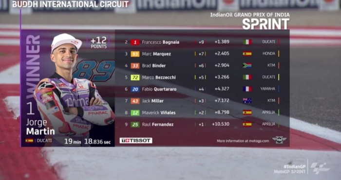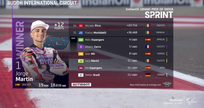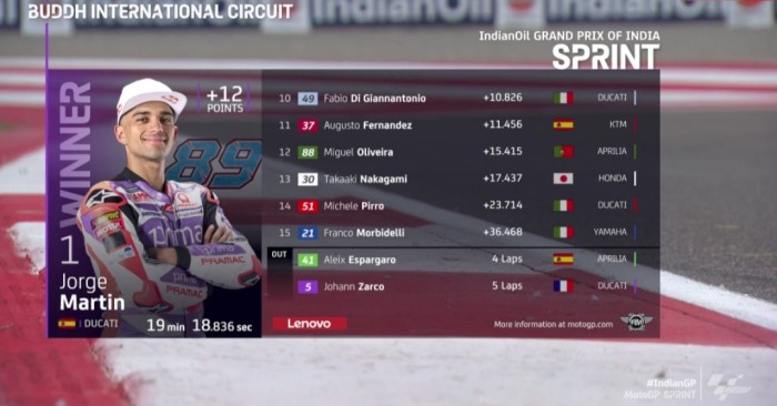 Dilansir okeSport, Martin sejak awal memimpin tanpa ada tekanan dari pesaingnya, sebab jarak dari posisi kedua selalu 2 detik lebih. Sementara posisi kedua menjadi milik Francesco Bagnaia (Ducati Lenovo).