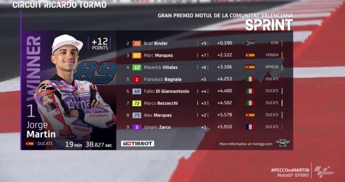 SuarIndonesia — Jorge Martin memenangkan Sprint Race MotoGP Valencia di Sirkuit Ricardo Tormo, putaran ke-20 akhir musim kejuaraan dunia 2023, Sabtu (25/11/2023).