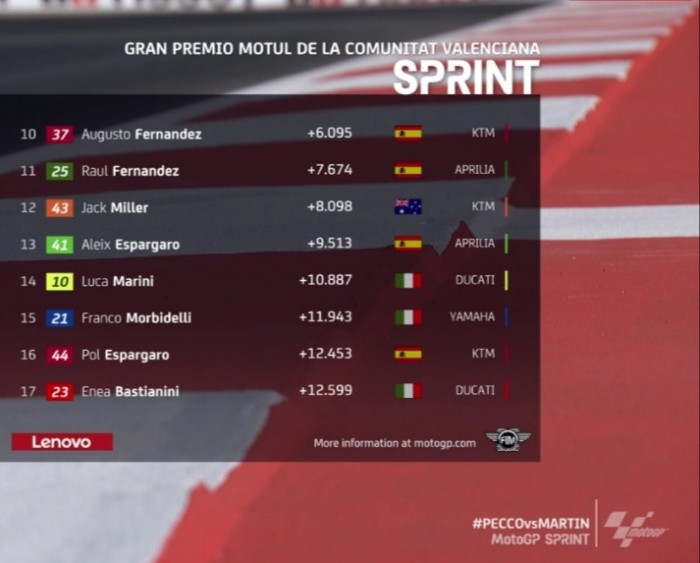 Namun itu membuka jalan bagi Marc Marquez dan Brad Binder untuk melewati keduanya dan ketika Martin mengejar tiga pebalap di depan, Bagnaia segera membuat pebalap mengantri di belakangnya di posisi kelima.