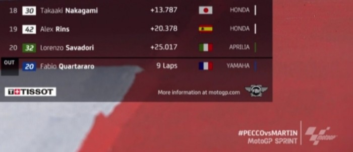 Fabio Quartararo terjatuh saat mencoba melewati Bagnaia di Tikungan 6 sementara di depan Vinales, Binder, Martin (kini ketiga) dan Marc Marquez saling berhadapan.
