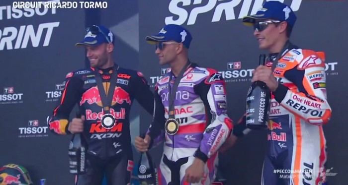 Brad Binder (KTM) dan Marc Marquez 2-3, di akhir pekan terakhir Repsol Honda, bergabung dengan pebalap Pramac Ducati itu di podium, dengan pemimpin gelar Francesco Bagnaia kehilangan poin di urutan kelima.