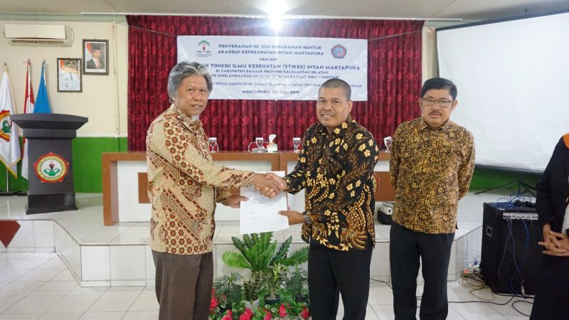 Penyerahan SK Menteri Riset, Teknologi dan Pendidikan Tinggi (Menristekdikti) tentang ijin Perubahan Bentuk Akademi Keperawatan Intan Martapura menjadi Sekolah Tinggi Ilmu Kesehatan (Stikes) Intan Martapura serahkan pada Kepala Lembaga Layanan Pendidikan Tinggi (LLDIKTI) Wilayah XI Kalimantan, Prof. Dr Udiansyah kepada Ketua Yayasan Banjar Insan Prestasi, Dr Taufik Arbain, Minggu lalu.