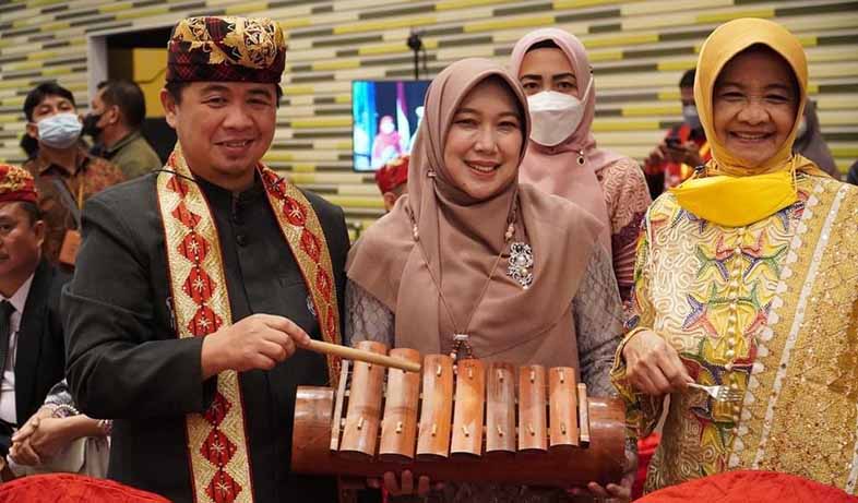 SuarIndonesia – Hadiri puncak syukuran perayaan HUT APEKSI ke-22 Tahun 2022, Walikota Banjarmasin, H Ibnu Sina terpilih untuk dipasangkan Selendang Tapis Khas Lampung sebagai salam selamat datang di Kota Bandar Lampung didampingi Ketua TP PKK Kota Banjarmasin, Hj Siti Wasilah.