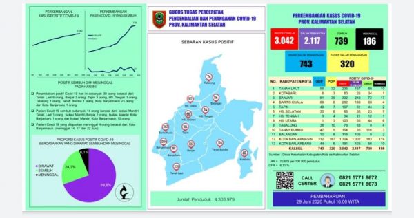 PDP berjumlah 320 dan ODP berjumlah 743. Penambahan kasus baru berjumlah 39 orang berasal dari Tanah Laut 6 orang, Banjar dan Tapin masing-masing 3 orang, Banjarmasin 23 orang, dan masing-masing 1 orang dari HST, Tabalong, Tanah Bumbu, dan Banjarbaru.