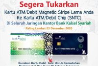 SuarIndonesia – Diberitahukan kepada seluruh nasabah Bank Kalsel Syariah yang masih menggunakan kartu ATM/Debit Magnetic Stripe lama agat segera melakukan penukaran ke kartu ATM/Debit…
