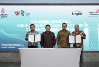 Direktur Utama Telkom Ririek Adriansyah (paling kiri) bersama CEO Singtel Group Yuen Kuan Moon (paling kanan) usai penandatanganan MoU kolaborasi untuk pengembangan bisnis data…