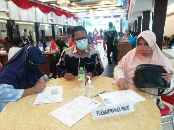 SuarIndonesia – Sejumlah Purnawirawan Polri, vaksinasi Covid-19 tahap pertama, di Aula Mathilda Batlayeri Polda Kalsel, Jumat (12/3/2021).