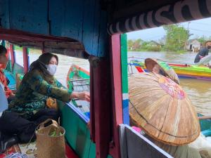 Di lokasi pertama ini, selain turut membeli dagangan para pedagang tradisional yang berjualan di atas jukung, Safriati dan DPW Adwil Kemendagri juga membagikan masker gratis kepada apra pedagang dan masyarakat.