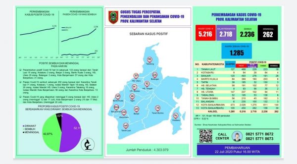 SuarIndonesia – Secara keseluruhan, Rabu (22/7/2020), kasus Covid-19 di Kalsel berjumlah 5.216 terdiri dari 2.718 dalam perawatan, 2.236 sembuh, dan 262 meninggal dunia.