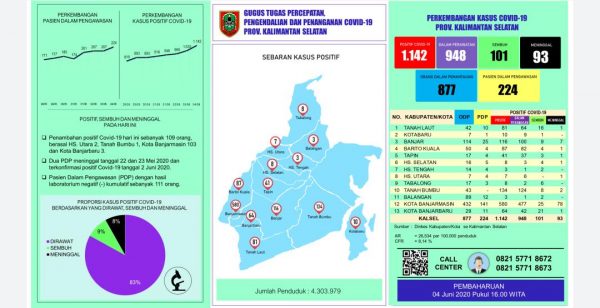 “Secara keseluruhan kasus terdiri dari 948 dalam perawatan, 101 sembuh, dan 93 meninggal,” jelas Juru Bicara Gugus Tugas Percepatan Penanganan Covid-19 Kalsel, HM Muslim.