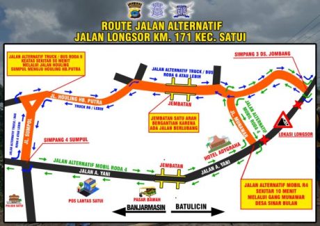 Untuk sementara arus lalu lintas dialihkan melalui jalan alternatif, bagi mobil roda enam ke atas dari arah Banjarmasin masuk Simpang empat Sompul menuju Jalan Hauling HB. Putra keluar di simpang tiga atau under pass H Abidin.