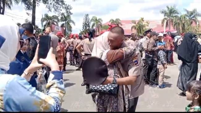 SuarIndonesia – Rasa haru terpancar dari keluarga yang menjemput anaknya usai mengikuti upacara penutupan pelantikan dan pengambilan sumpah siswa pendidikan pembentukan Tamtama Polri Ta 2024 di SPN Polda Kalsel di Banjarbaru, Rabu (18/12/2024).