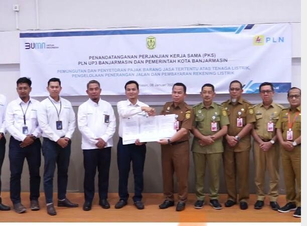 SuarIndonesia – Pemerintah Kota (Pemko) Banjarmasin melaksanakan Penandatanganan Perjanjian Kerja Sama (PKS) dengan UP3 PLN perihal Pemungutan dan Penyetoran Pajak Barang Jasa Tertentu atas Tenaga Listrik, Pengelolaan Penerangan Jalan serta Pembayaran Rekening Listrik.