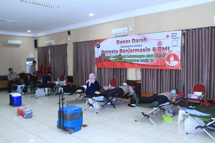 Kegiatan donor darah berlangsung di ruang Rupatama Polresta Banjarmasin, dalam rangka antisipasi kekurangan stok darah imbas Covid-19.