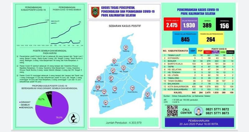 Secara keseluruhan kasus covid di Kalsel berjumlah 2.475 terdiri dari 1.930 dalam perawatan, sembuh 389, dan meninggal 156, sedangkan PDP berjumlah 264, dan ODP berjumlah 845.