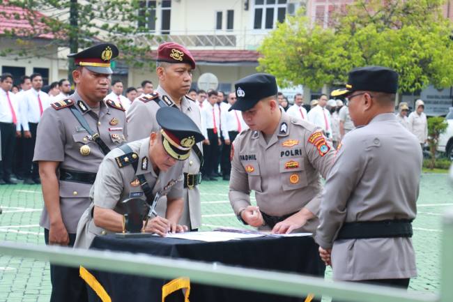 Serah terima jabatan (sertijab) dan pelantikan berlangsung di halaman Mapolresta Banjarmasin, Minggu (8/2/2026).