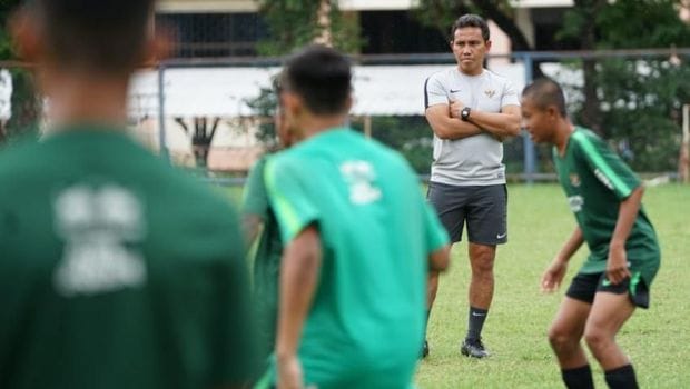Bima Sakti saat memimpin Timnas Indonesia U-15 latihan. Marcel Januar dkk menang 2-0 atas Vietnam di laga perdana Piala AFF U-15 2019. (pssi.org)