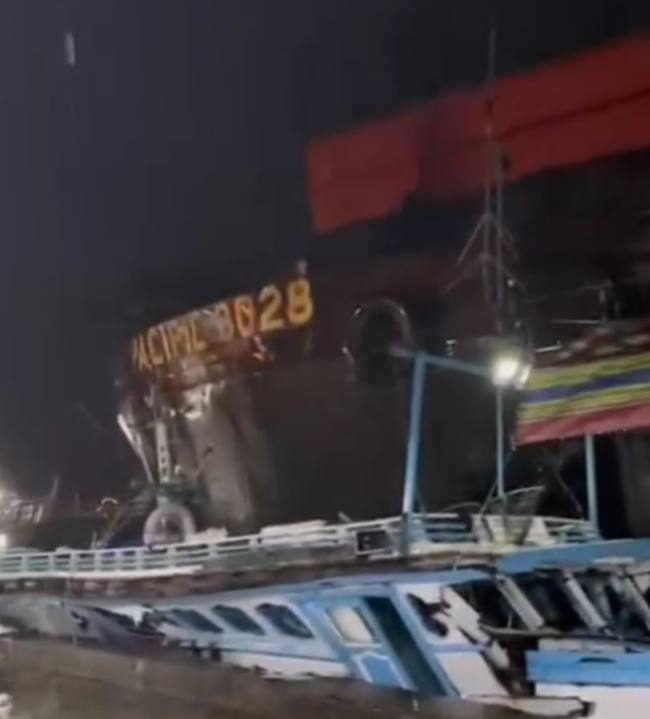 Dalam video tersebut terlihat sebuah tongkang pengangkut batu bara dalam kondisi kosong, diketahui bernama Tongkang Pacifik 3028, hanyut tak terkendali dan menghantam sejumlah kapal nelayan yang sedang sandar di dermaga.