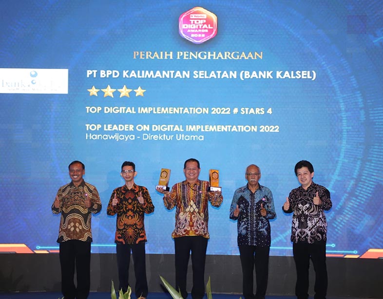 Sebagai apresiasi atas kinerja yang sangat memuaskan itu, dimana telah melalui uji kelayakan dan penilaian yang ketat oleh Dewan Juri yang kredibel, Bank Kalsel dianugerahi penghargaan spesial sebagai Top Digital Implementation 2022 dengan Predikat “Bintang 4 – Sangat Baik” pada ajang TOP DIGITAL Awards 2022 yang dihelat di Hotel Raffles, Jakarta (15/12/2022).