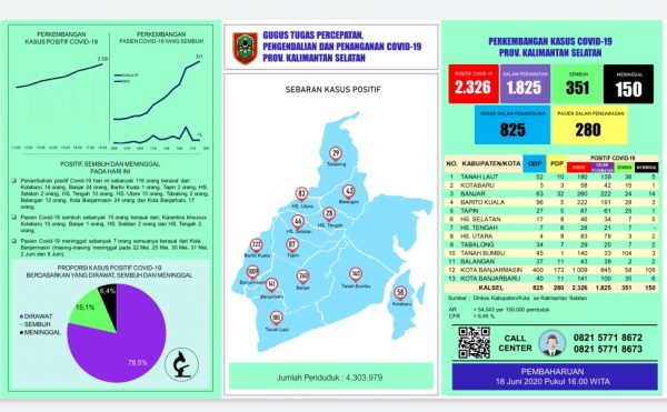 SuarIndonesia – Total kasus covid saat ini berjumlah 2.326 terdiri dari 1.825 dirawat, 351 sembuh, dan 150 kematian.