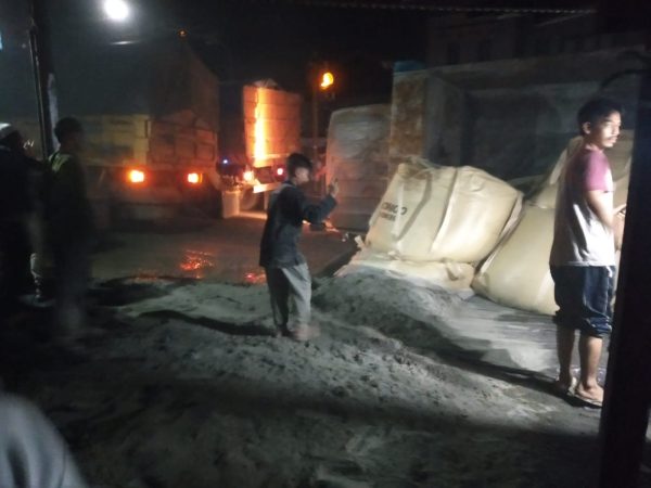 SuarIndonesia – Truk mengangkut semen PT Conch oleng hingga terbalik, di Desa Palampitan, Kecamatan Amuntai, (Hulu Sungai Utara) Kalimantan Selatan. terlihat dalam video warga banua, Minggu malam (12/12/2021),