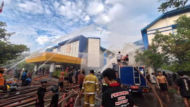 Petugas dari Barisan Pemadam Kebakaran (BPK) bekerja keras melakukan penyemprotan air dari berbagai penjuru untuk mengendalikan kobaran yang terus meluas.