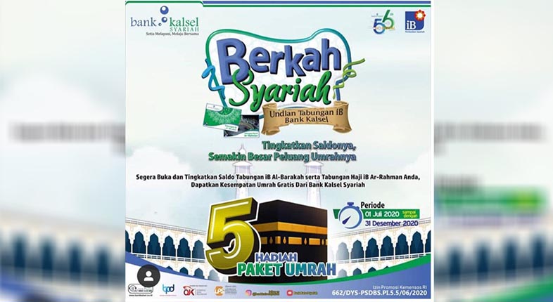 Bank Kalsel Syariah memberikan hadiah 5 (lima) Paket Umrah bagi nasabah yang beruntung. Periode pengumpulan poin mulai tanggal 01 Juli 2020 sampai dengan 31 Desember 2020.
