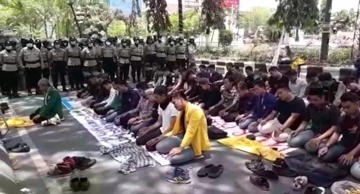 Puluhan mahasiswa melakukan salat zuhur berjamaah di halaman Kantor DPRD Kalsel. (Istimewa/suarindonesia.com)