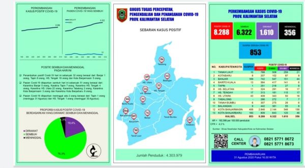 Pada Senin (31/8/2020) kasus baru berjumlah 32 orang berasal dari Banjar 1 orang, Tapin 8 orang, HST 18 orang, dan Banjarmasin 5 orang.