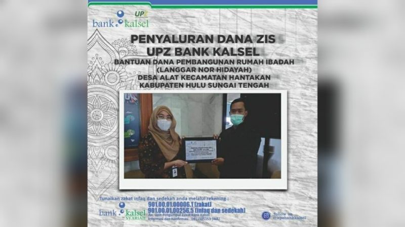 Melihat kondisi yang memprihatinkan tersebut, Unit Pengelola Zakat (UPZ) Bank Kalsel memberikan bantuan dana untuk pembangunan rumah ibadah, yaitu Langgar Nor Hidayah di Desa Alat Kecamatan Hantakan Kabupaten Hulu Sungai Tengah (HST).